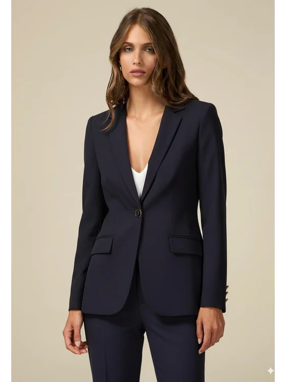 Blazer realizzato in confortevole jersey punto milano; chiusura monopetto con bottone singolo dorato, tasche a patta davanti; maniche lunghe con bottoni decorativi sui polsini, spacco centrale sul retro; possibilità di abbinarlo ai pantaloni coordinati.