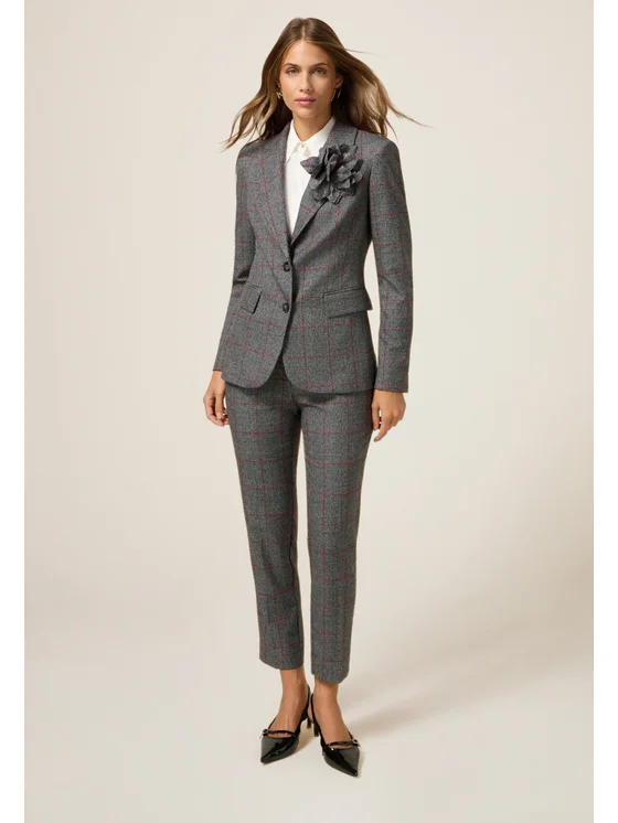Blazer realizzato in tessuto check; chiusura a bottoni, tasche a patta davanti e spilla a fiore nello stesso tessuto; possibilità di abbinarlo ai pantaloni coordinati.
