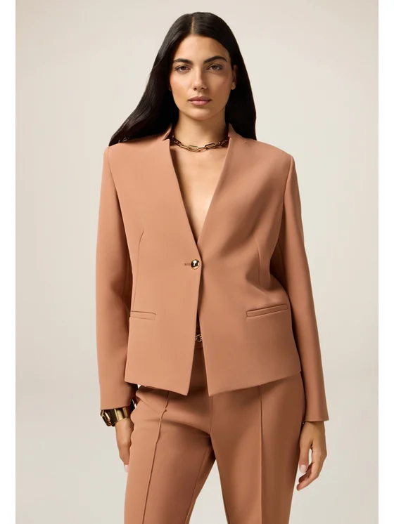 Blazer realizzato in tessuto tecnico stretch; chiusura monopetto con bottone singolo in metallo dorato, senza revers, finte tasche a filetto davanti; possibilità di abbinarlo ai pantaloni coordinati; MADE IN ITALY.