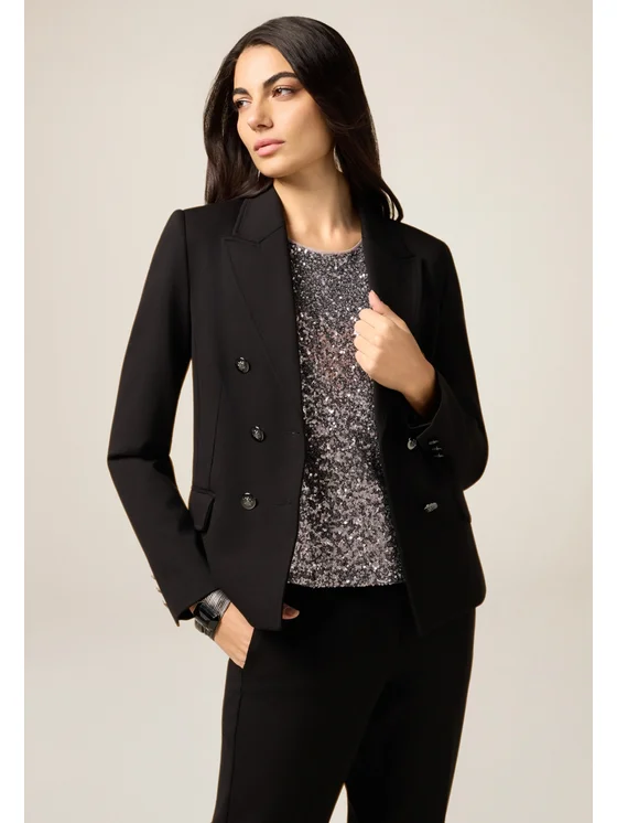 Blazer realizzato in consistente jersey punto milano; chiusura doppiopetto con bottoni, tasche a patta davanti; possibilità di abbinarlo ai pantaloni coordinati.