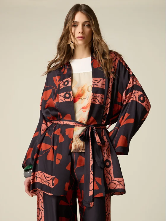 Giacca kimono realizzata in fluido raso di viscosa fantasia; lunghezza media, cintura da annodare in vita; possibilità di abbinarla ai pantaloni coordinati; MADE IN ITALY.