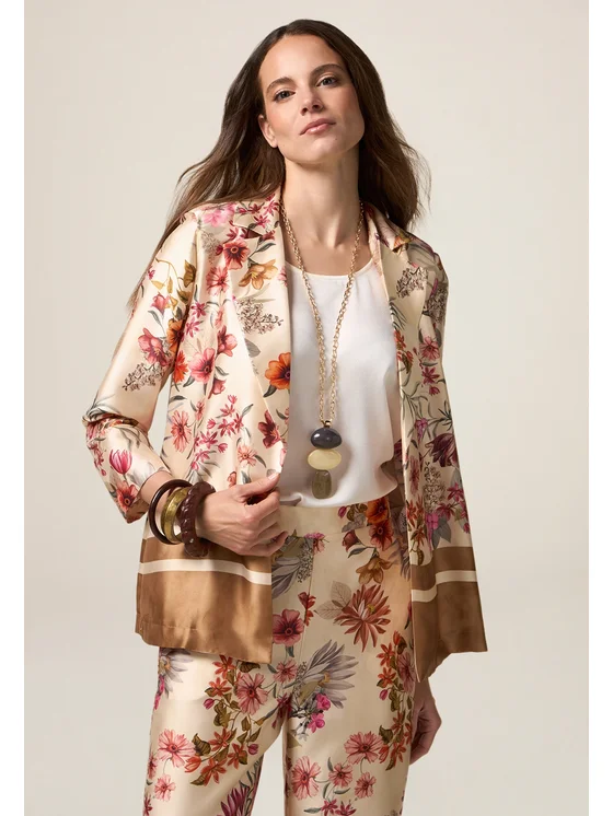 Giacca destrutturata in fluido raso fantasia; maniche dritte a 7/8; possibilità di abbinarla ai pantaloni coordinati; MADE IN ITALY.