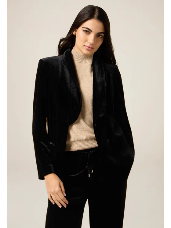 Giacca strutturata realizzata in velluto ad effetto sparkling; chiusura monopetto a bottoni foderati, finte tasche a patta davanti; possibilità di abbinarlo ai pantaloni coordinati.