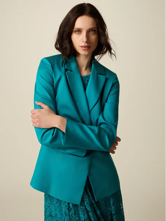 Giacca blazer realizzata in fluido lyocell; chiusura con spilla gioiello decorativa sul davanti; revers a lancia e maniche lunghe; possibilità di abbinarla ai pantaloni coordinati.