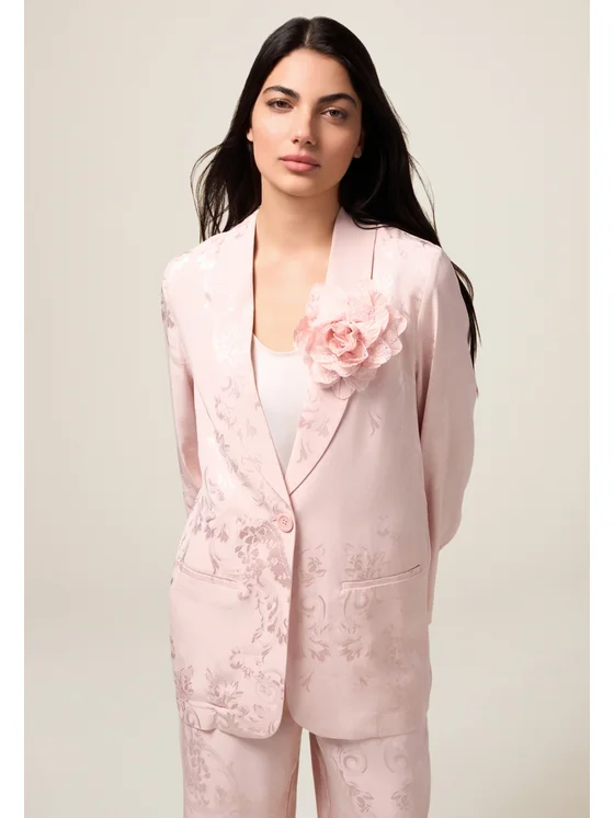 Blazer realizzato in tessuto jacquard di viscosa; chiusura monopetto con bottone singolo, tasche a filetto davanti; maxi spilla a fiore, staccabile; possibilità di abbinarlo ai pantaloni coordinati.