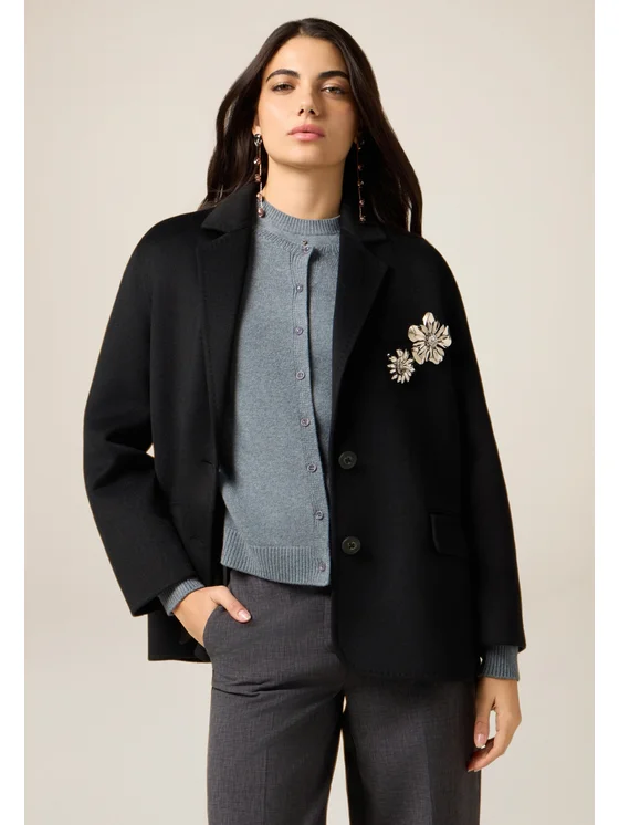 Giacca destrutturata realizzata in tessuto double misto lana; vestibilità regular con chiusura monopetto a bottoni; maniche lunghe, tasche a patta davanti e spille in metallo, removibili.