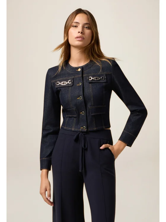 Giacca realizzata in denim misto cotone a lavaggio blu scuro rinse; taglio corto, chiusura monopetto con bottoni metallici, linea slim; maniche lunghe, tasche applicate sul petto con dettaglio di catene metalliche.