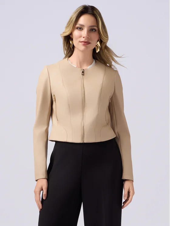 Giubbotto corto realizzato in morbido tessuto spalmato; chiusura a zip metallica davanti, scollatura tonda; tasche davanti e fodera interna tono su tono.
