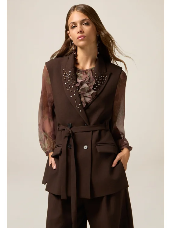 Gilet realizzato in tela tinta unita; lunghezza midi con chiusura doppiopetto e cintura da annodare; revers impreziositi da applicazioni metalliche e tasche applicate davanti; MADE IN ITALY.