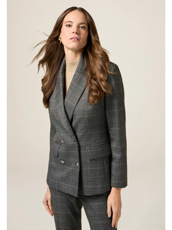 Giacca realizzata in tessuto check misto viscosa con inserto di filo lurex; chiusura doppiopetto a bottoni metallici in stile araldico, fodera interna e lunghezza media; maniche lunghe, tasche a patta davanti; possibilità di abbinarla ai pantaloni coordinati.