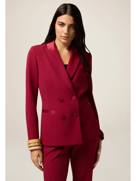 Blazer realizzato in tessuto crêpe; vestibilità regular, lunghezza media, chiusura doppiopetto con bottoni foderati; maniche a tre quarti, tasche con profili in raso.