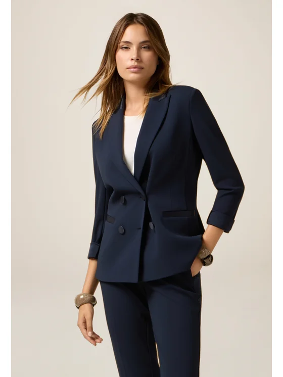 Blazer realizzato in tessuto crêpe; vestibilità regular, lunghezza media, chiusura doppiopetto con bottoni foderati; maniche a tre quarti, tasche con profili in raso.