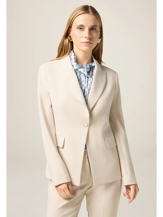 Blazer realizzato in tessuto misto viscosa; linea ad A con chiusura monopetto a singolo bottone; revers classici, maniche lunghe e tasche a patta sul davanti.