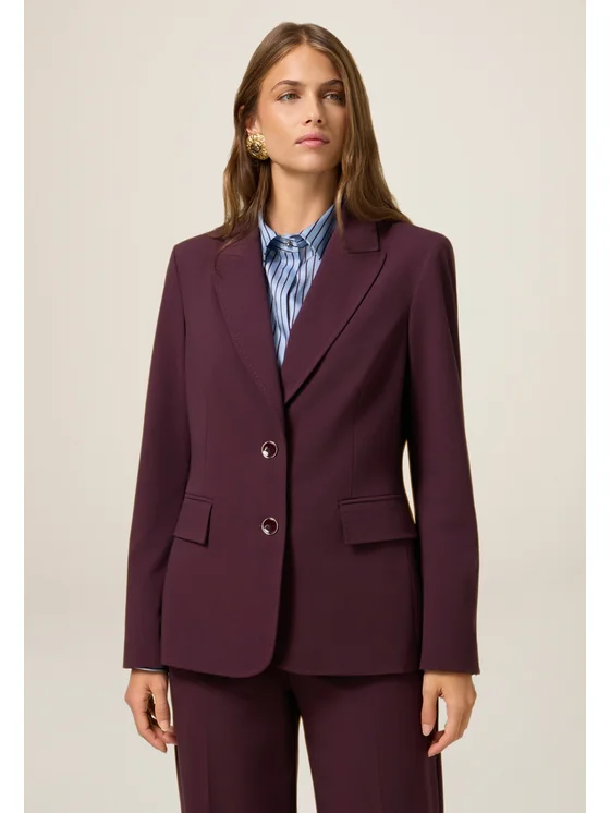 Blazer realizzato in flanella misto viscosa; dettaglio di impunture sui revers, chiusura a doppio bottone, tasche a patta davanti; possibilità di abbinarlo ai pantaloni coordinati.