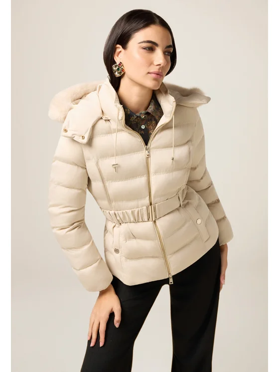 Piumino pesante realizzato in nylon trapuntato; cappuccio con bordo peloso, staccabile; cintura elasticizzata da chiudere in vita; il capo presenta una calda imbottitura sintetica.