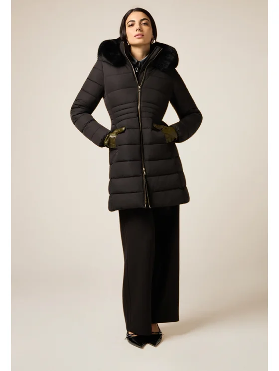 Piumino dalla linea sciancrata realizzato in nylon con trapuntature sagomate; lunghezza media, chiusura a zip metallica con doppio cursore; cappuccio con bordatura in tessuto peluche, calda imbottitura in ovatta.