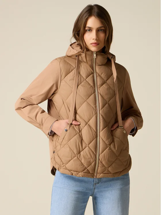 Giubbotto in nylon con pannello frontale trapuntato a motivo geometrico; cappuccio con coulisse regolabile, chiusura frontale a zip metallica; maniche lunghe lisce, tasche frontali e dettaglio di bottoni laterali sul fondo.