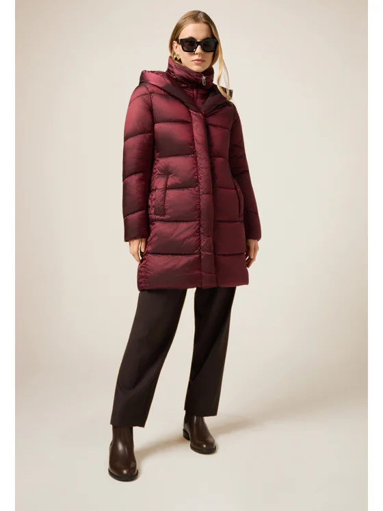 Piumino pesante realizzato in nylon a trapuntature orizzontali; modello lungo con calda imbottitura interna; cappuccio, collo interno, chiusura a zip nascosta.
