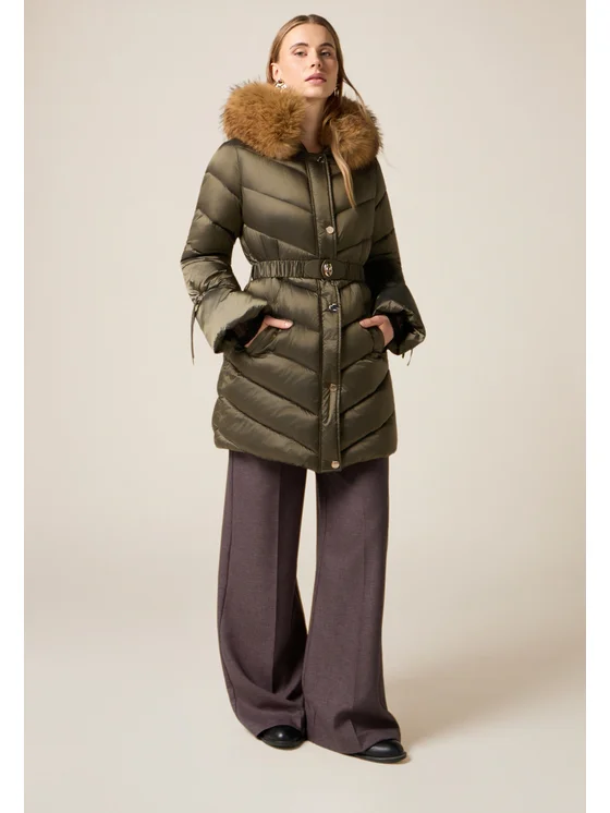 Piumino realizzato in nylon a trapuntature diagonali; lunghezza midi, chiusura a zip, bottoni e cintura elasticizzata; cappuccio con bordatura in tessuto effetto peluche, maniche lunghe con motivo di coulisse.