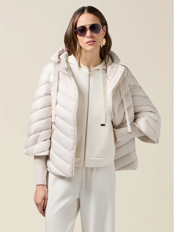 Piumino realizzato in nylon trapuntato; maniche a tre quarti con manicotti a coste, staccabili; cappuccio, chiusura a zip centrale e tasche davanti.