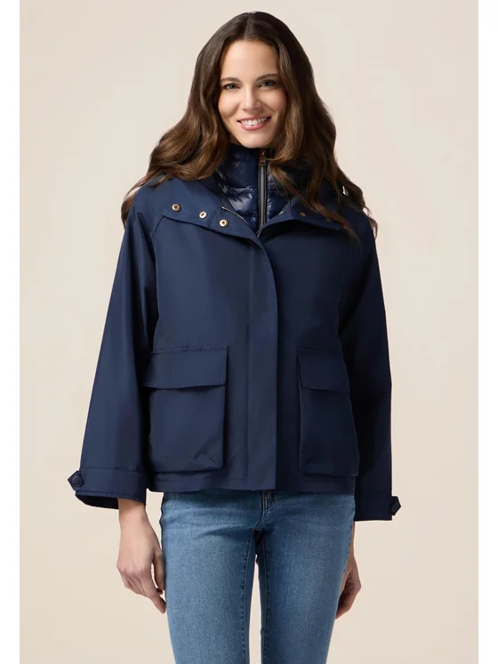 Giubbotto in nylon tinta unita con cappuccio e maxi tasche davanti; gilet lightweigth interno, con cappuccio e chiusura a zip; i due capi sono dotati di una mostrina e di un bottone che permette loro di essere indossati insieme o singolarmente.