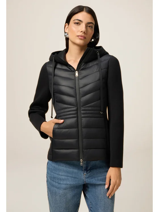 Piumino lightweight a trapuntature; chiusura frontale con zip a doppio cursore, cappuccio regolabile con coulisse; maniche lunghe in tessuto scuba, tasche laterali.