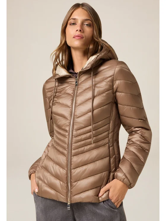 Piumino lightweight in nylon a trapuntatura chevron; cappuccio con interno a contrasto colore; chiusura frontale con zip, tasche laterali.
