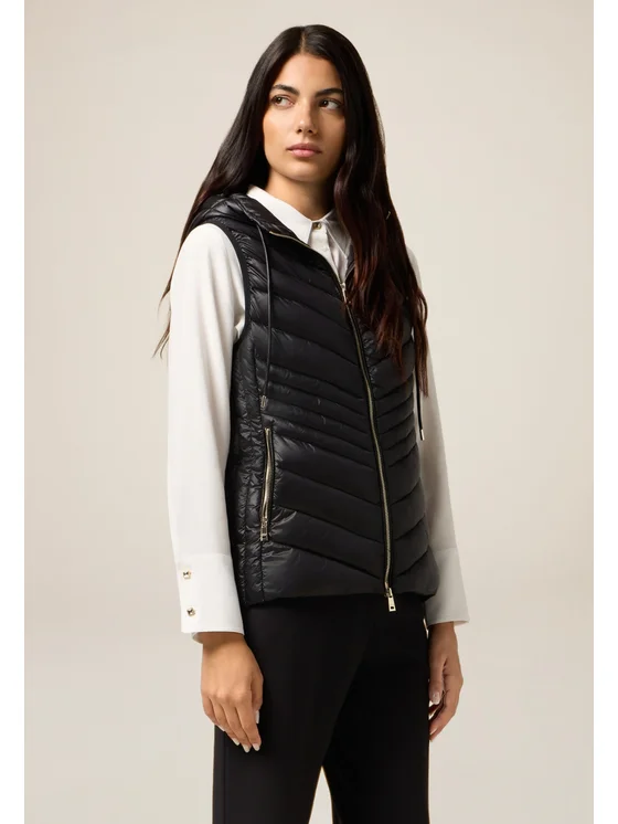 Piumino lightweight a gilet in nylon trapuntato; chiusura frontale con zip, tasche lungo i fianchi; cappuccio con coulisse.