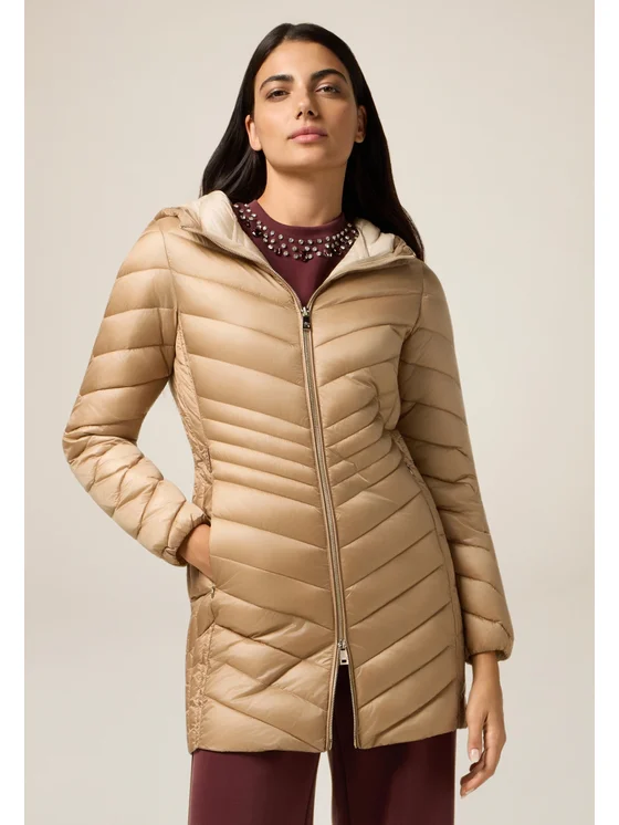 Piumino lightweight in nylon a trapuntature chevron; lunghezza media, chiusura frontale con zip e linea slim; tasche laterali con zip invisibile.