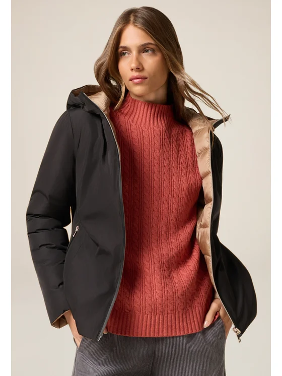 Piumino lightweight reversibile realizzato in nylon liscio; modello corto con cappuccio e chiusura frontale a zip; maniche lunghe, tasche laterali con zip.