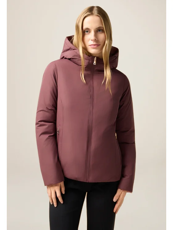 Piumino lightweight reversibile realizzato in nylon liscio; modello corto con cappuccio e chiusura frontale a zip; maniche lunghe, tasche laterali con zip.