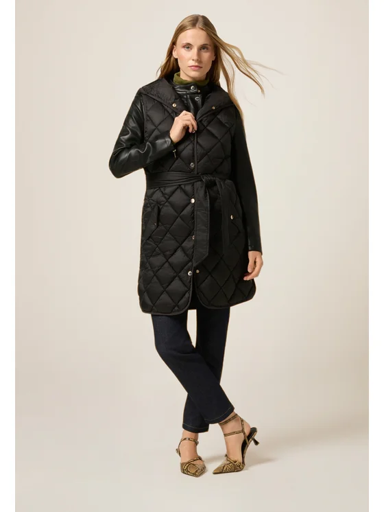 Piumino lightweight senza maniche in nylon trapuntato; lunghezza media, chiusura con bottoni; fusciacca da annodare in vita, cappuccio, tasche frontali con bottoni a pressione.