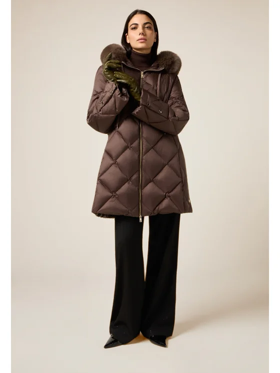 Piumino realizzato in nylon trapuntato a rombi; linea svasata, lunghezza midi e dettaglio di bottoni metallici laterali sul fondo; chiusura a zip, pregiata imbottitura 80% piumino e 20% piume.