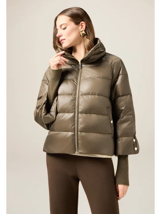 Piumino realizzato in nylon trapuntato; modello corto dalla linea dritta, chiusura frontale a zip metallica e collo alto a ciambella; maniche a kimono, a tre quarti, con parte terminale in tessuto a coste; il capo presenta una calda e pregiata imbottitura 80% piumino e 20% piume.