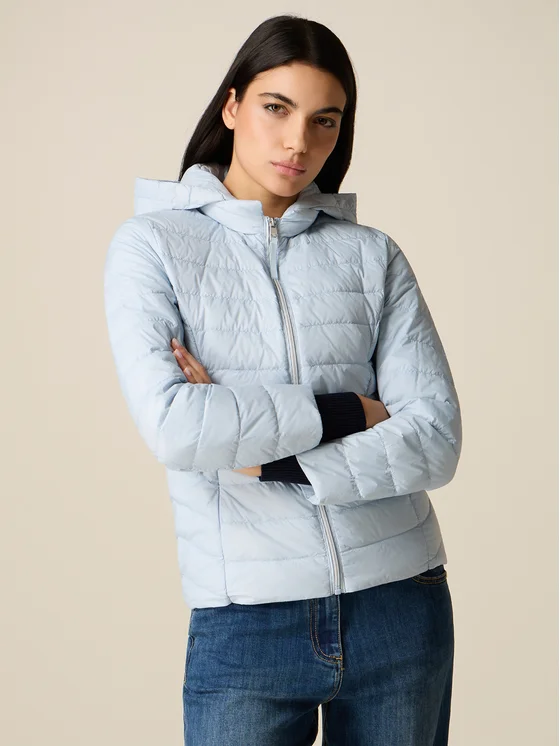 Piumino lightweight realizzato in nylon a trapuntature orizzontali; cappuccio, chiusura frontale a zip, vestibilità regular; il capo presenta un'imbottitura composta da 90% piumino e 10% piume.
