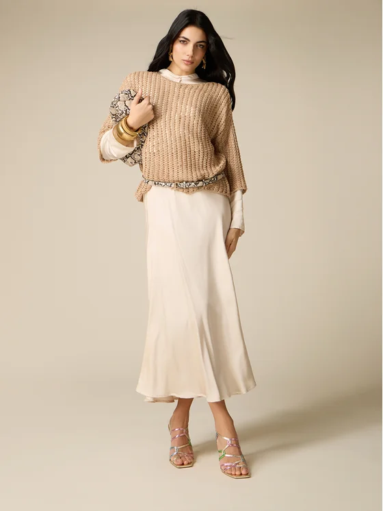 Gonna dalla linea ad A in raso di viscosa stretch; lunghezza alla caviglia; vita elasticizzata internamente; MADE IN ITALY.
