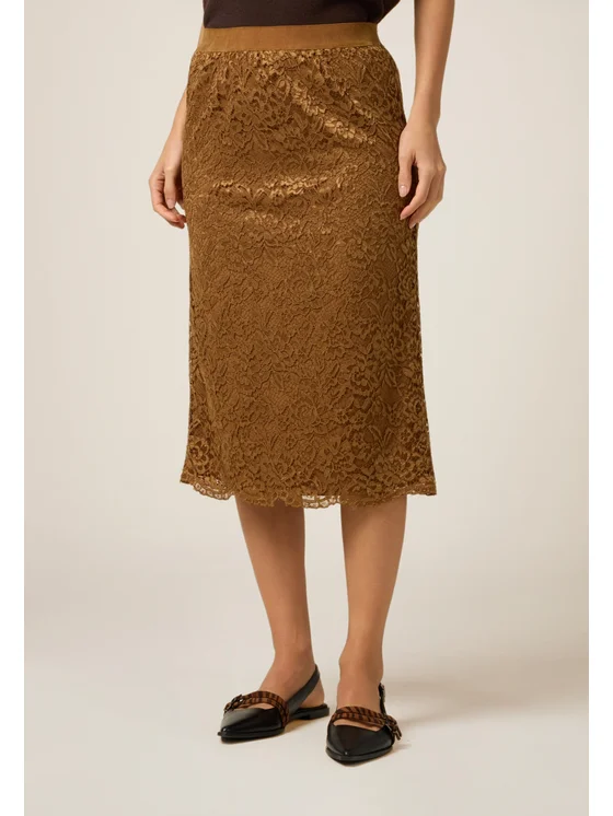 Gonna tubino realizzata in pizzo rebrodé; lunghezza midi con tape elasticizzato in vita; orlo smerlato sul fondo, possibilità di abbinarla alla camicia o alla blusa coordinate; MADE IN ITALY.