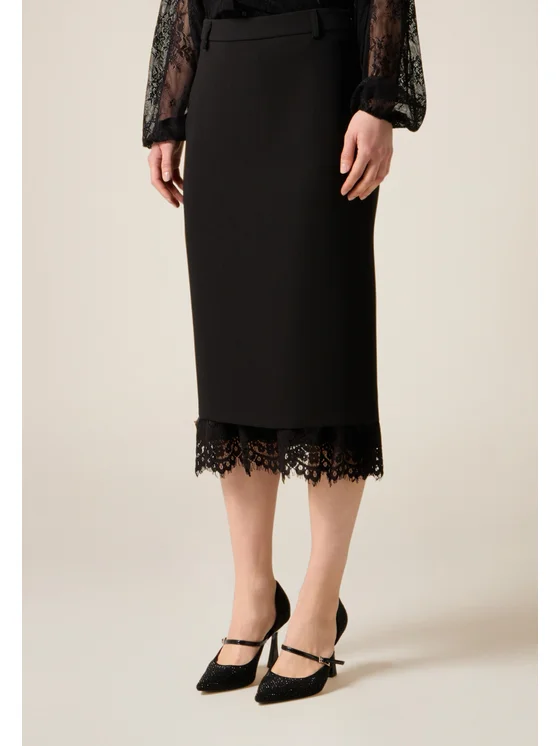 Gonna tubino realizzata in tessuto crêpe; lunghezza midi, inserto in raso e pizzo sul fondo, spacco posteriore; MADE IN ITALY.