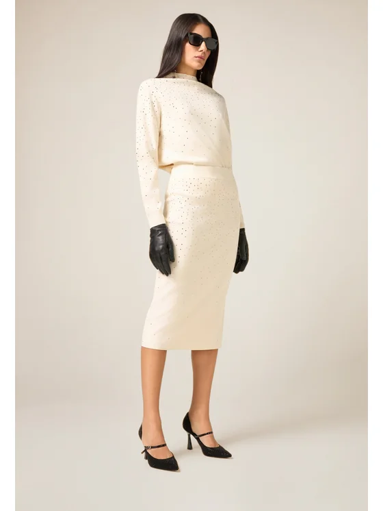 Gonna tubino realizzata in maglia misto viscosa; pioggia di cristalli dégradé, davanti; possibilità di abbinarla alla maglia coordinata.
