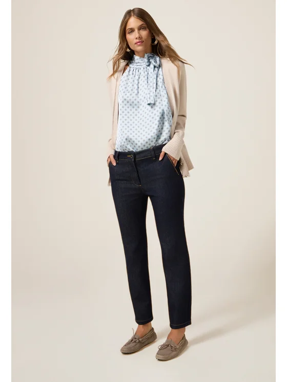 Jeans regular realizzati in denim blu scuro; modello a cinque tasche con chiusura frontale; tasche laterali inserite nei fianchi con dettaglio di impunture decorative e applicazioni