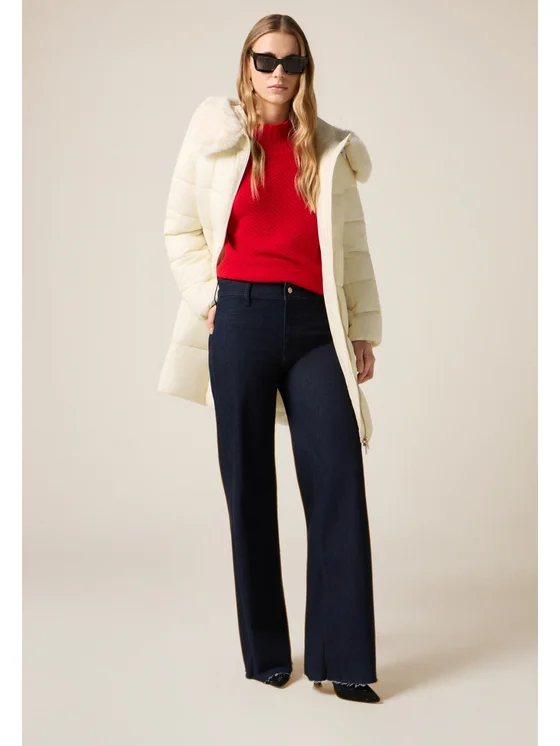 Jeans flare realizzati in denim a lavaggio blu scuro rinse; modello cinque tasche, impunture tono su tono, chiusura a zip e bottone; patch decorativo sulla gamba sinistra.