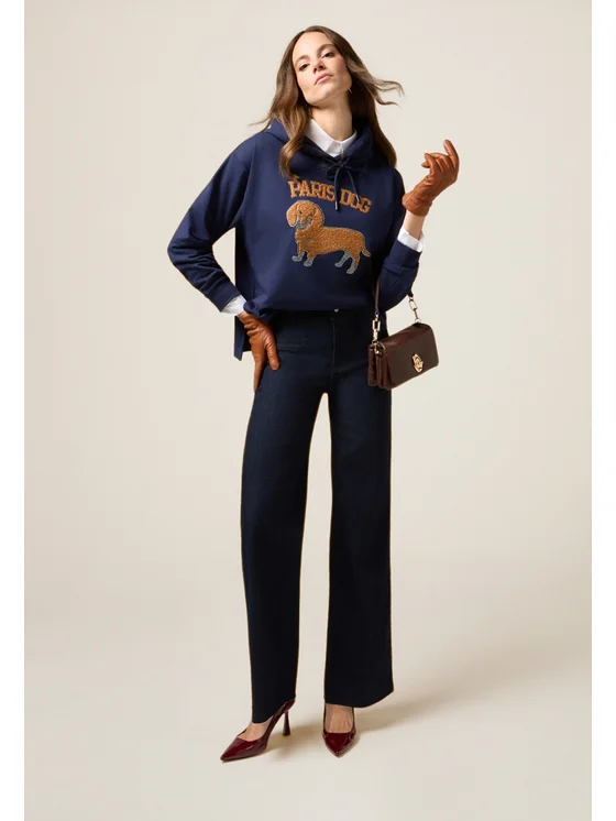 Jeans a palazzo realizzati in denim misto cotone a lavaggio blu scuro rinse; chiusura con bottoni e zip; finti taschini davanti e tasche applicate dietro.