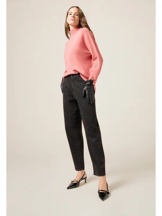 Jeans boyslim realizzati in denim misto cotone a lavaggio nero; pioggia di micro cristalli davanti; modello cinque tasche, impunture tono su tono.