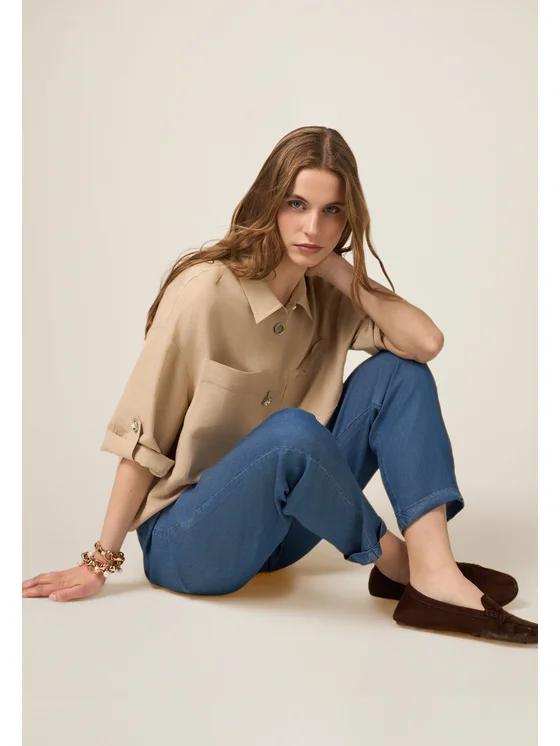 Joggers realizzati in fluido tencel effetto denim; vita elasticizzata con coulisse regolabile; tasche all'americana davanti e risvolto sul fondo gamba.