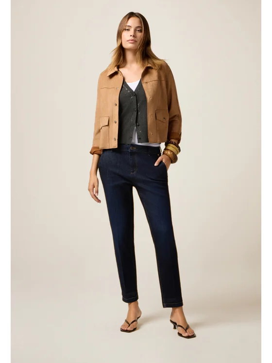 Jeans modello chino realizzati in denim di cotone a lavaggio blu scuro rinse; vestibilità regolare con chiusura a bottoni e zip; tasche all'americana davanti e finte, a filetto, dietro.
