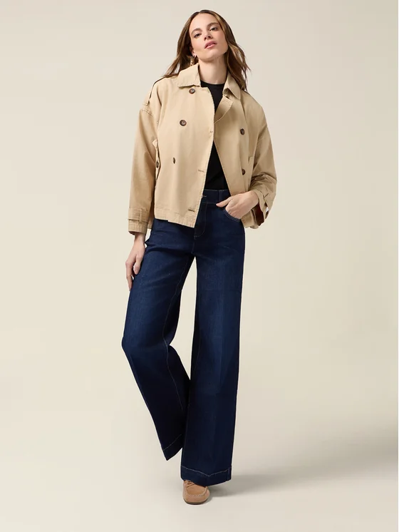Jeans realizzati in denim misto cotone a lavaggi blu scuro; modello cinque tasche con vita regolare e chiusura a bottone e zip; piega stirata lungo le gambe e impunture a contrasto colore.
