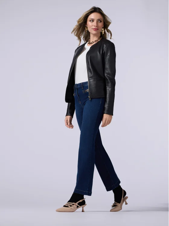 Jeans realizzati in denim di cotone stretch a lavaggio blu scuro; modello kick flare, impunture a contrasto colore; dettaglio di fibbie metalliche con micro cristalli ad ornare le finte tasche davanti.