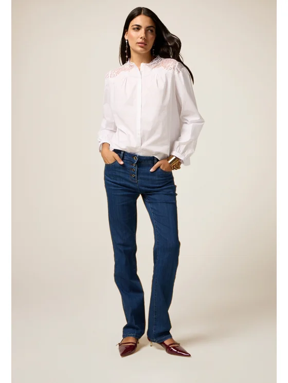 Jeans regular realizzati in denim misto cotone; modello cinque tasche, impunture a contrasto colore; chiusura a bottoni smaltati.