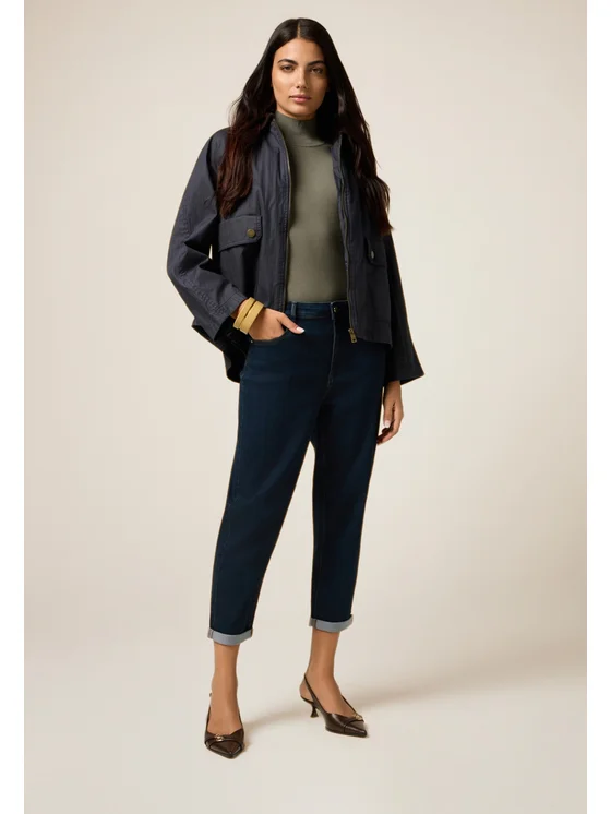 Jeans boyslim realizzati in denim di cotone a lavaggio blu scuro; modello cinque tasche con chiusura a bottone e zip; dettaglio metallico sulla tasca frontale destra.