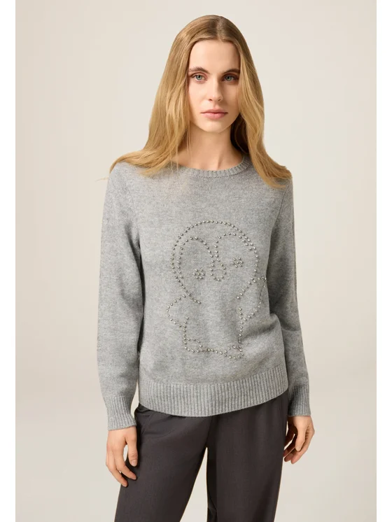 Maglia girocollo realizzata in filato misto cashmere; maniche lunghe e scollatura tonda; applicazioni decorative di micro cristalli davanti.